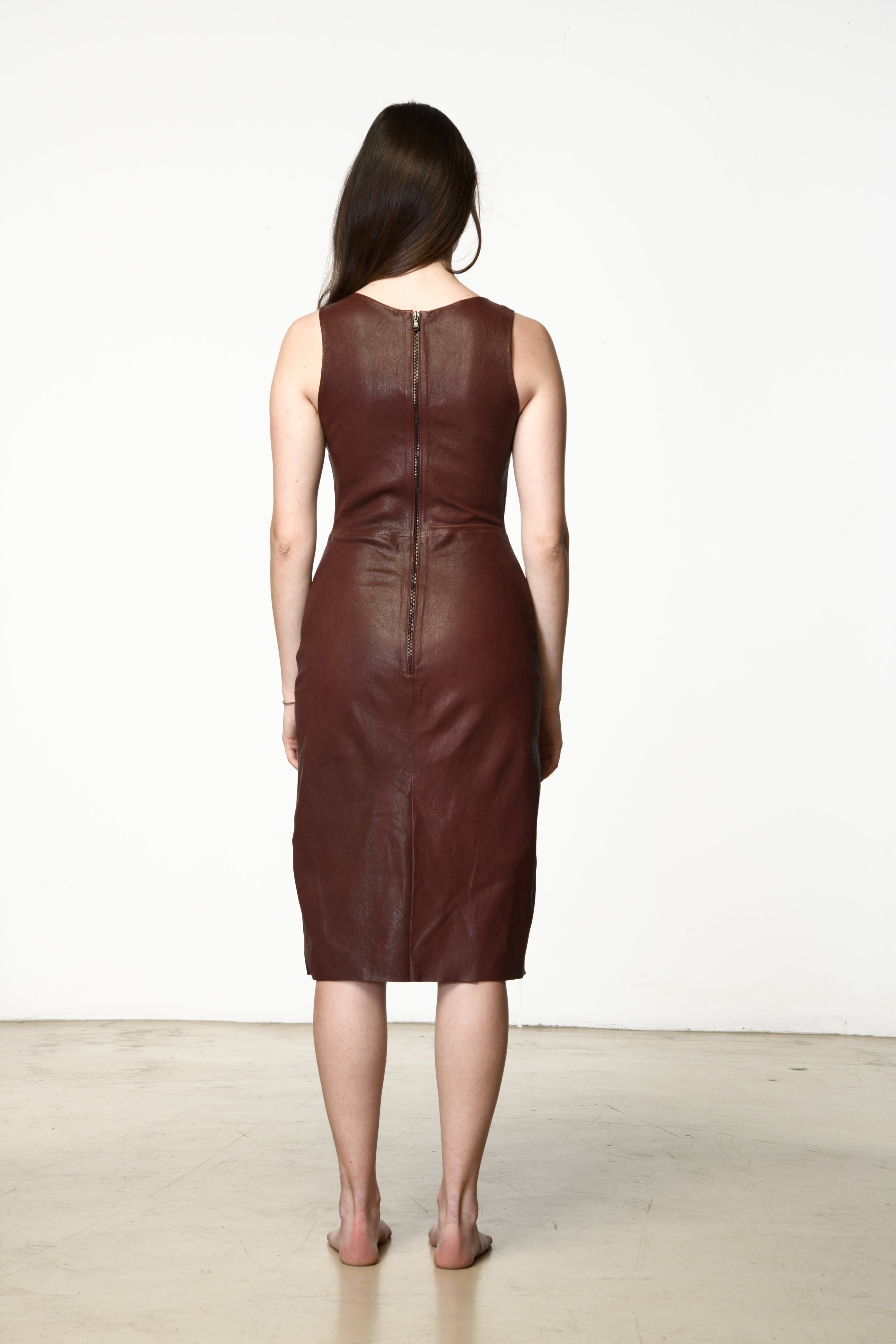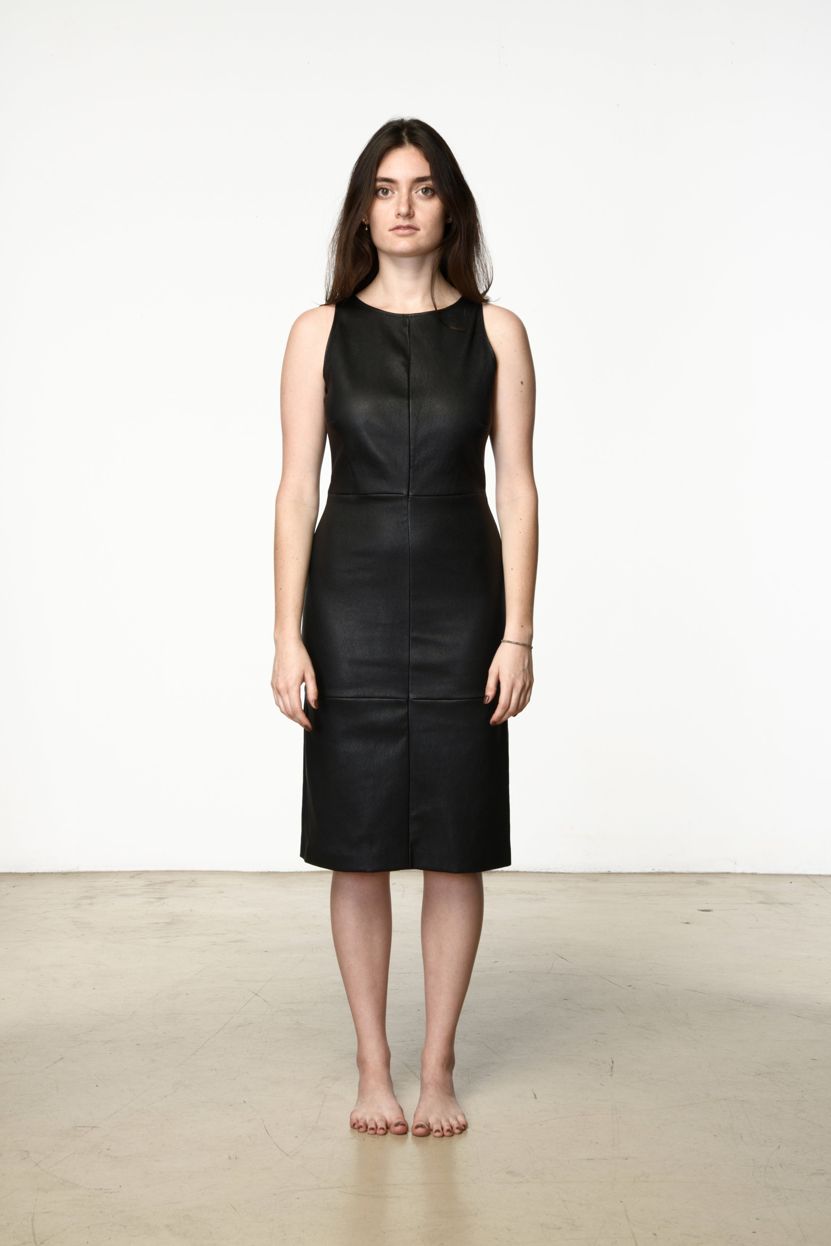 Midi dress in stretch nappa leather with a sleek fitted cut. A timeless silhouette defined by clean lines and modern elegance.