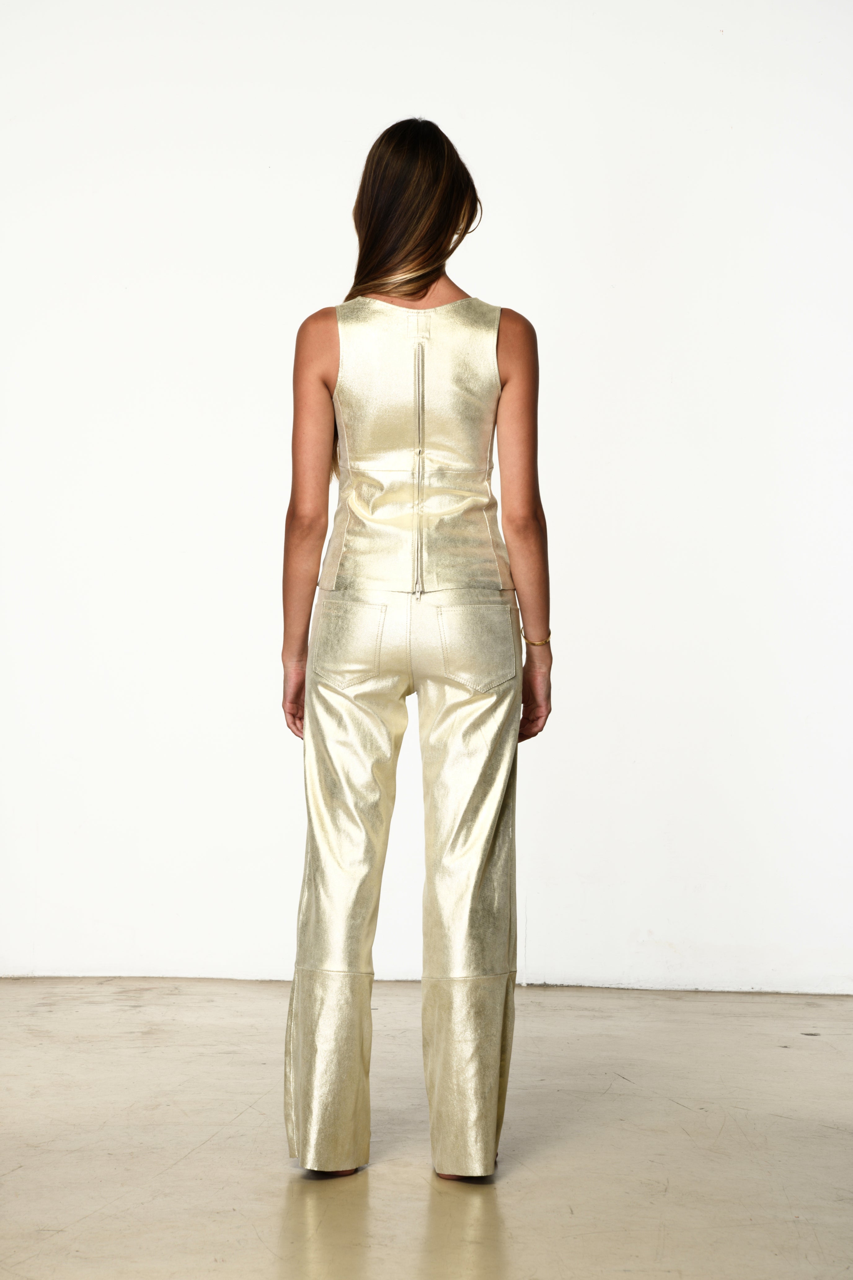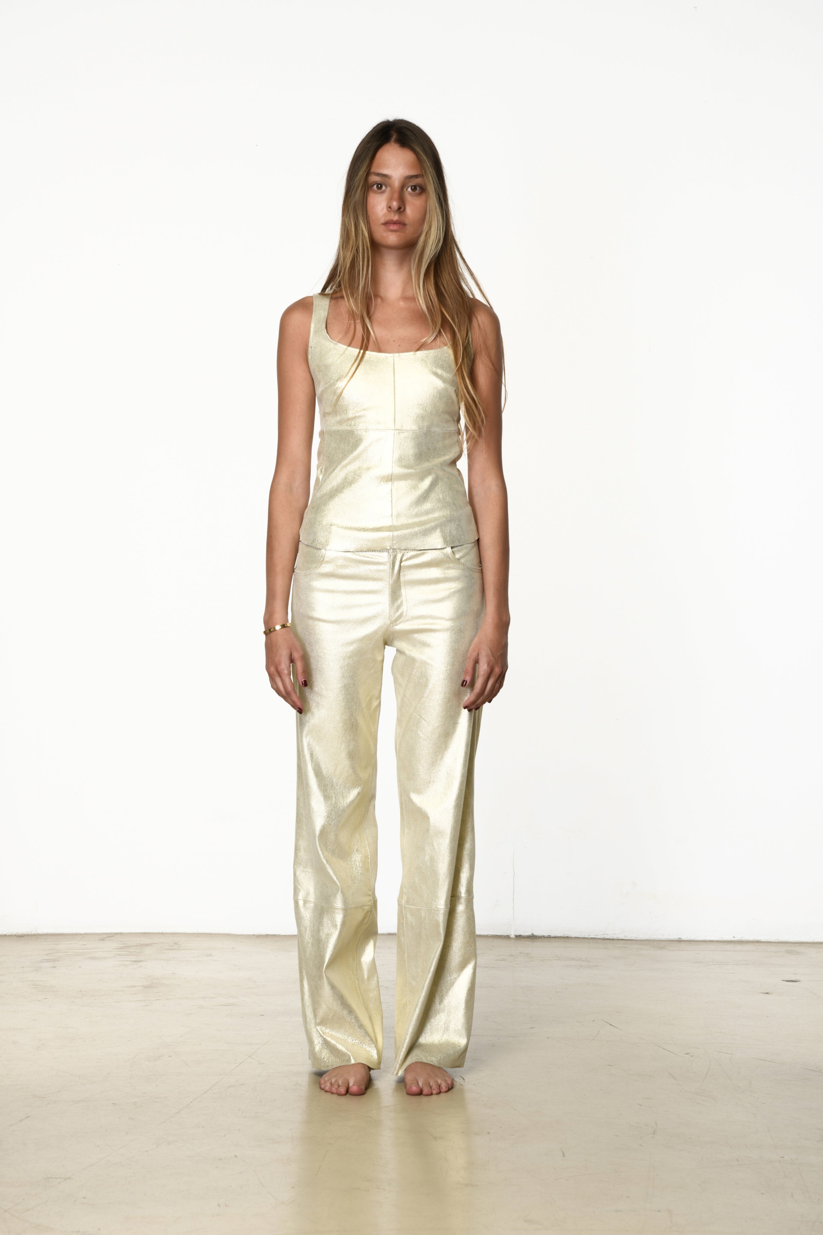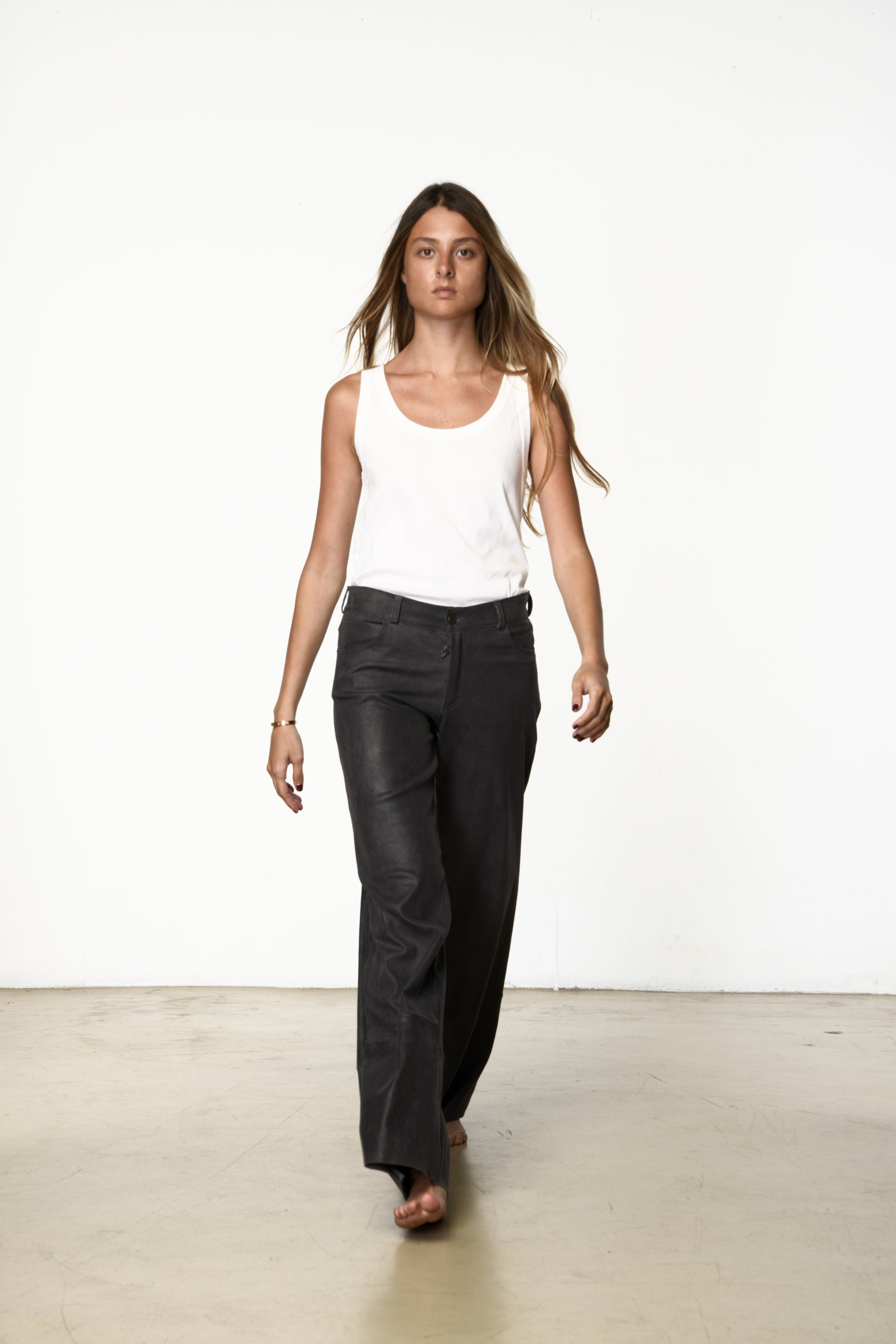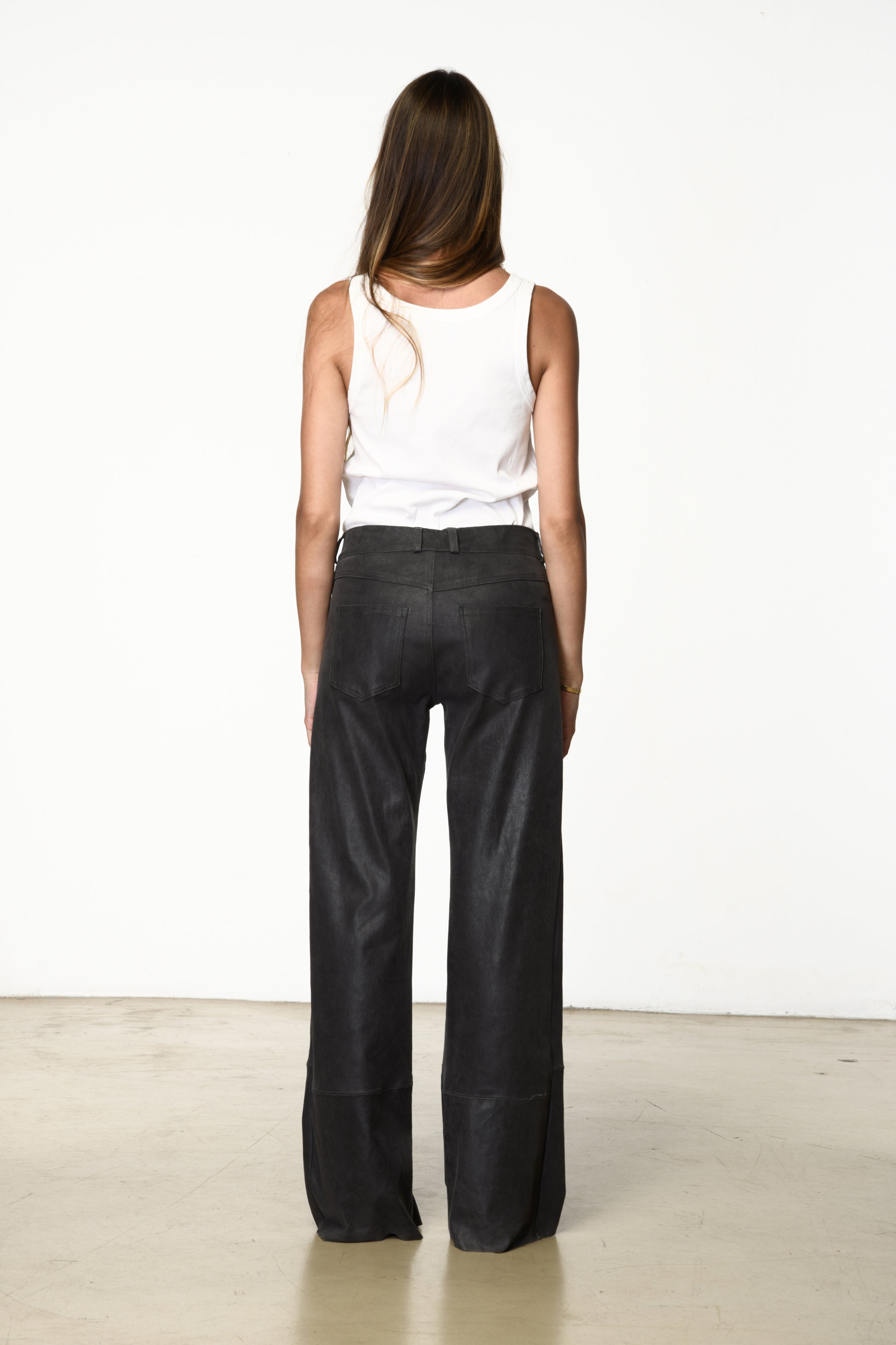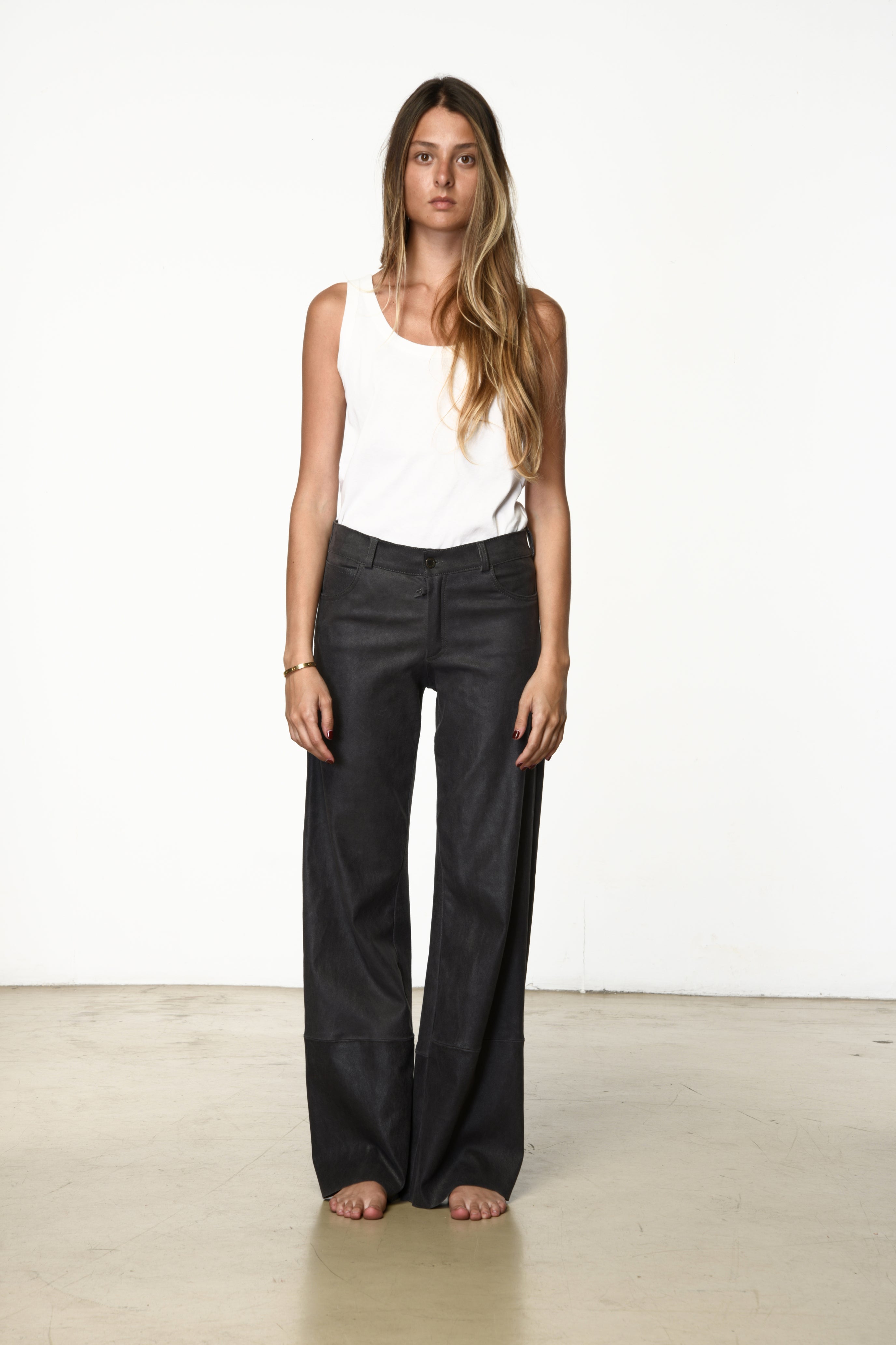 Five-pocket pants with a wide-leg silhouette. A relaxed fit that blends elegance with effortless allure.