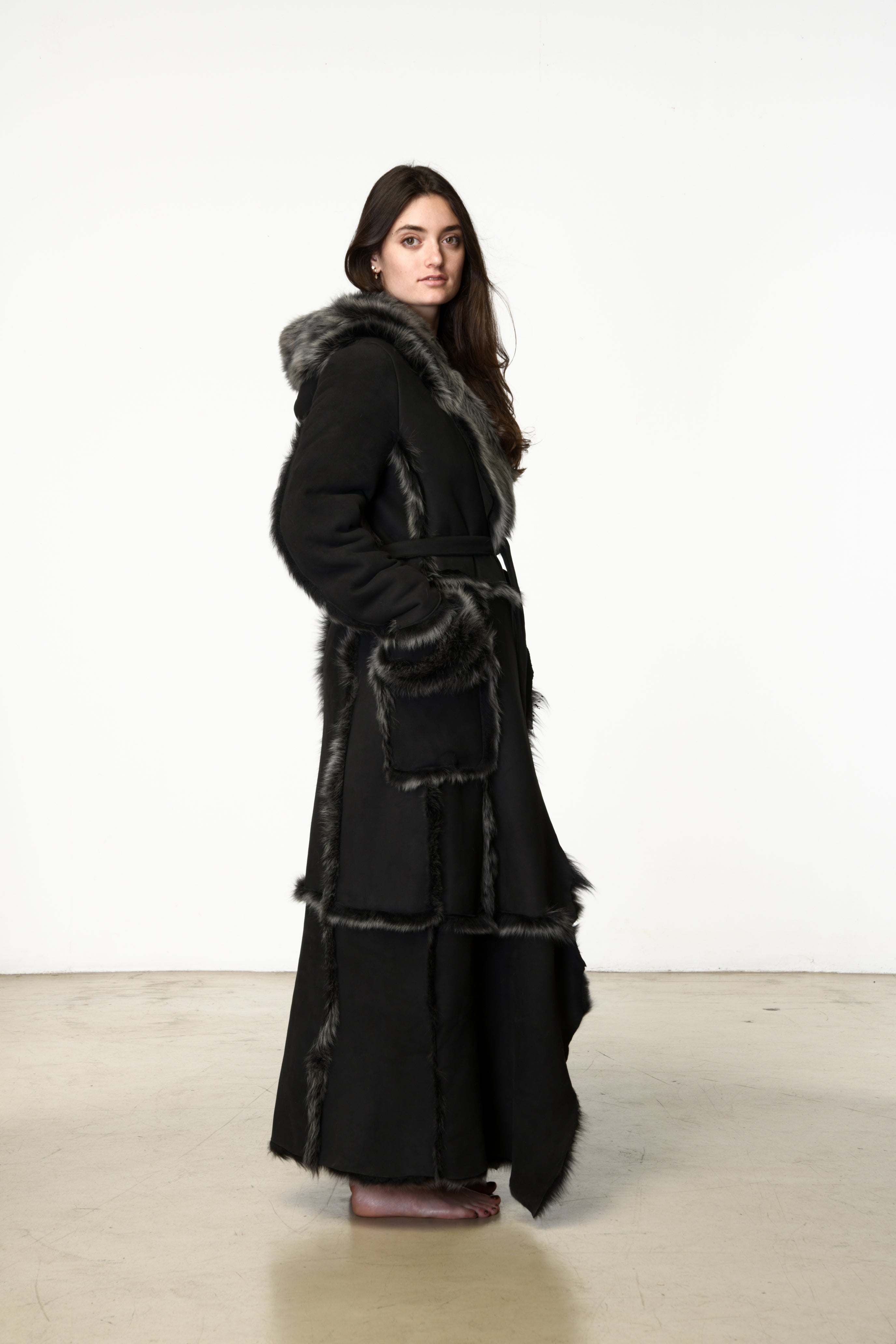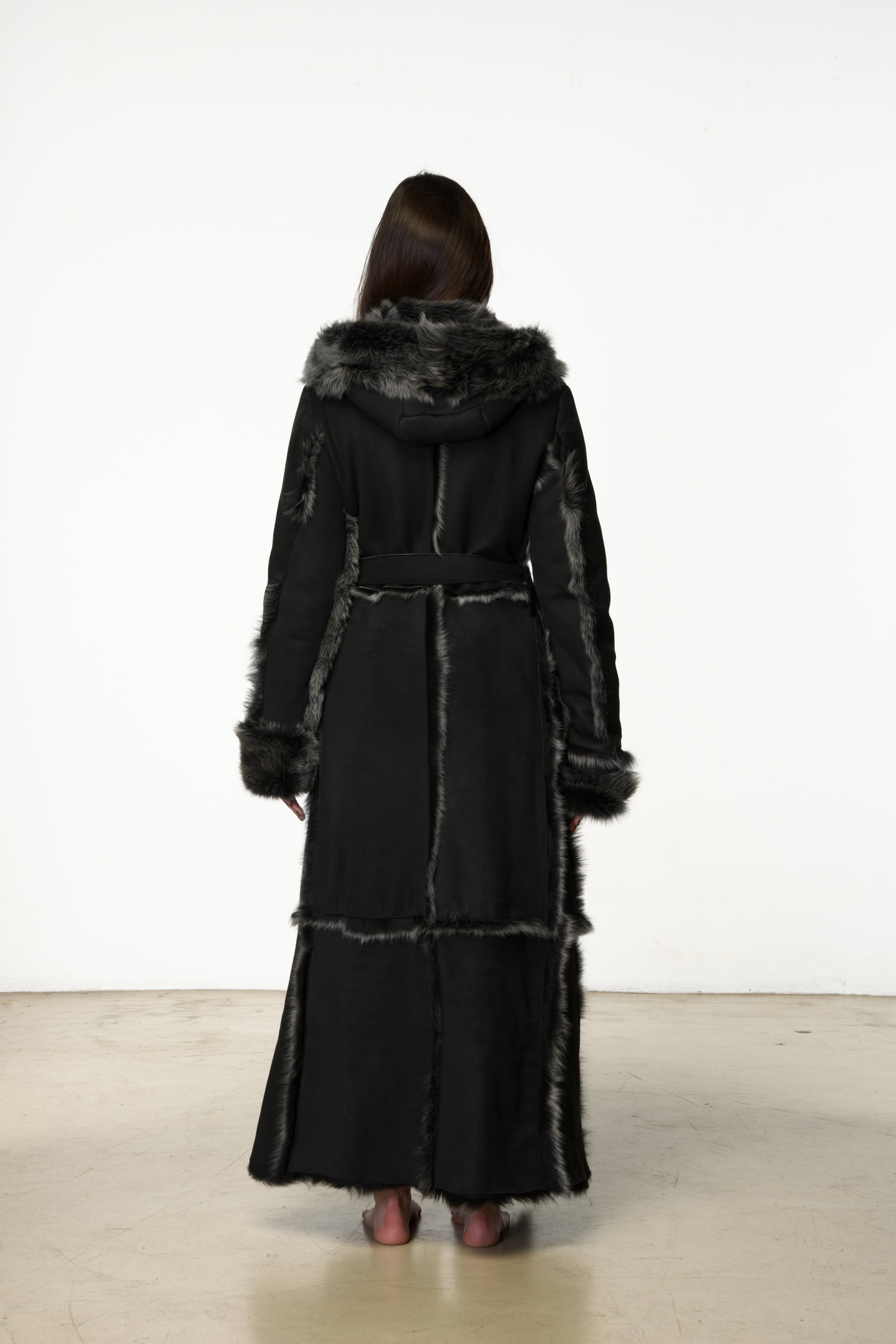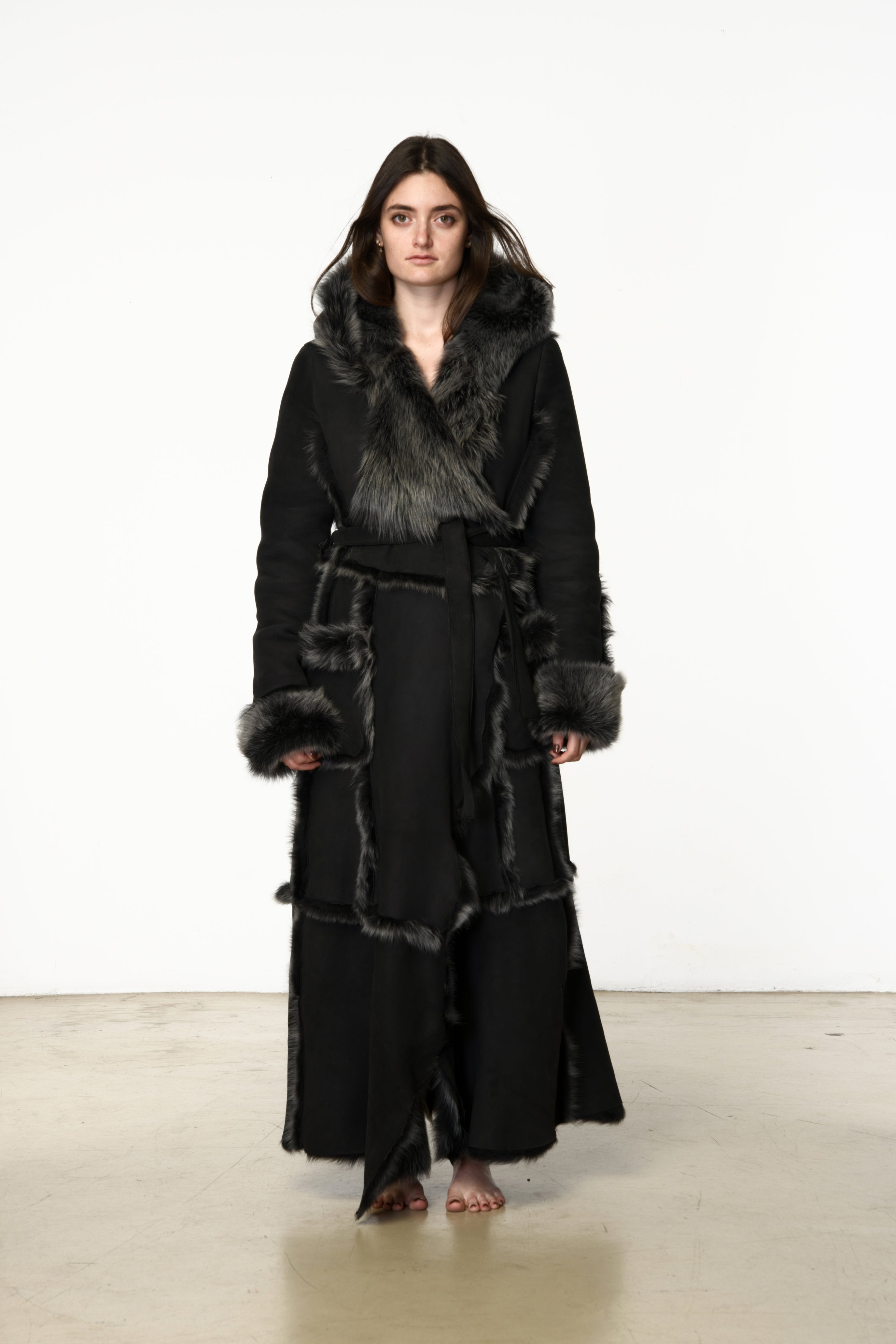 Long shearling coat with hood and robe-inspired cut. Warm and buttery soft.