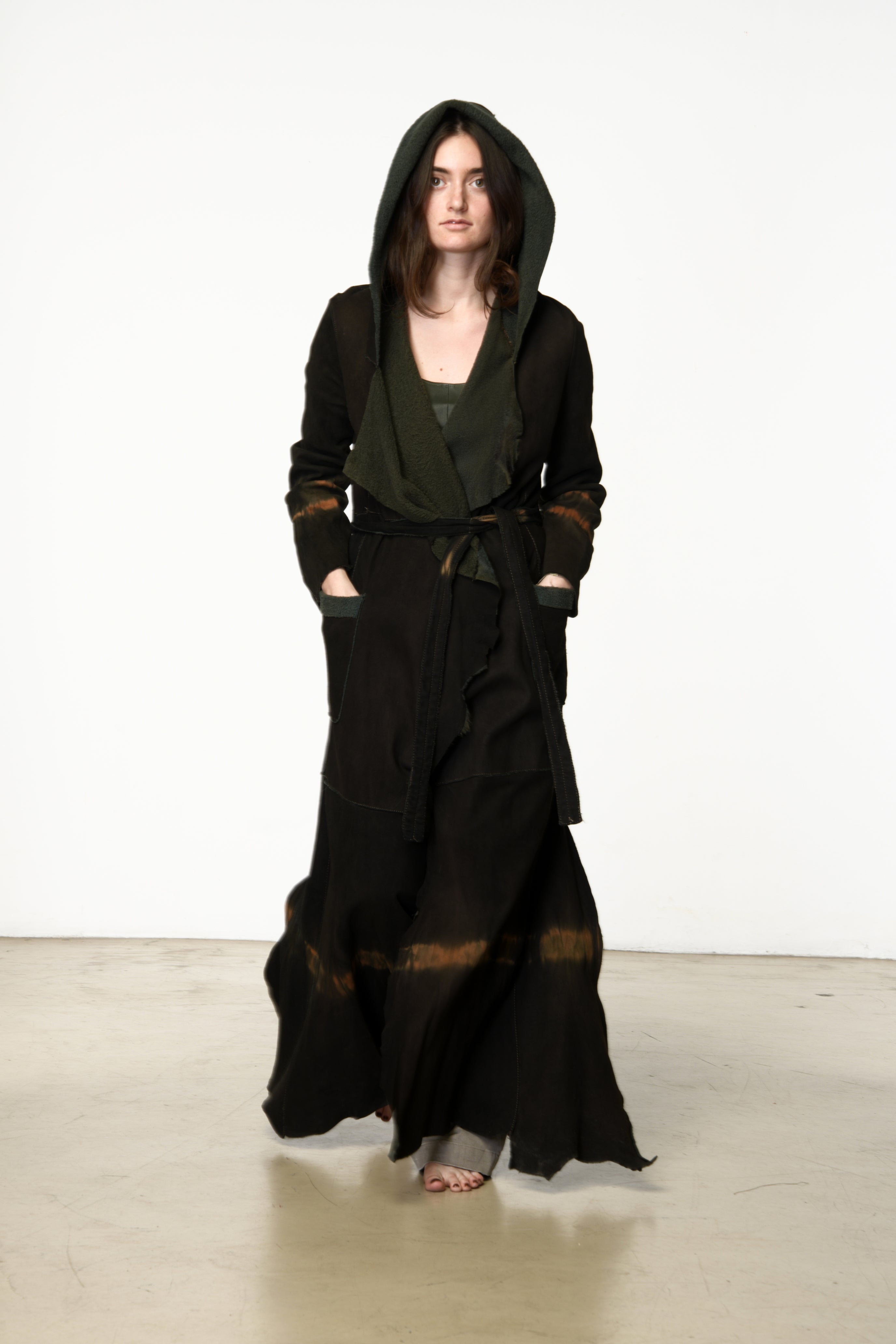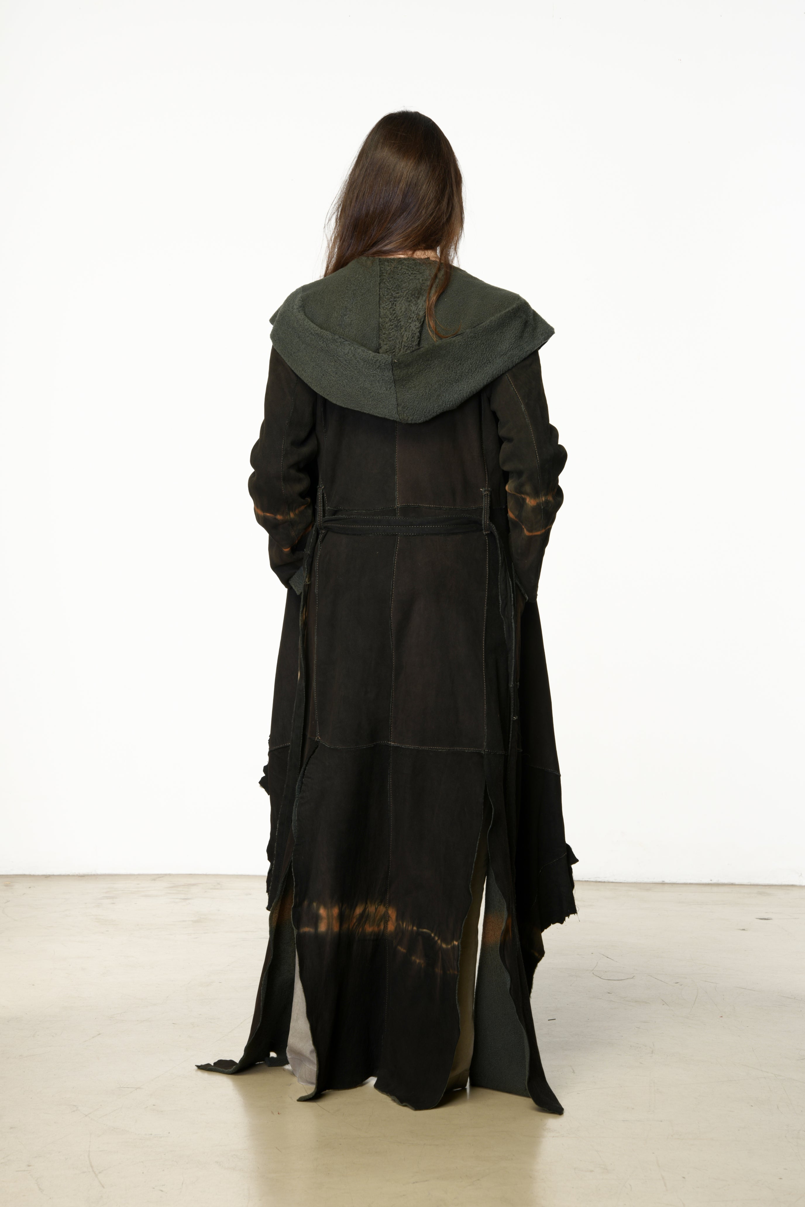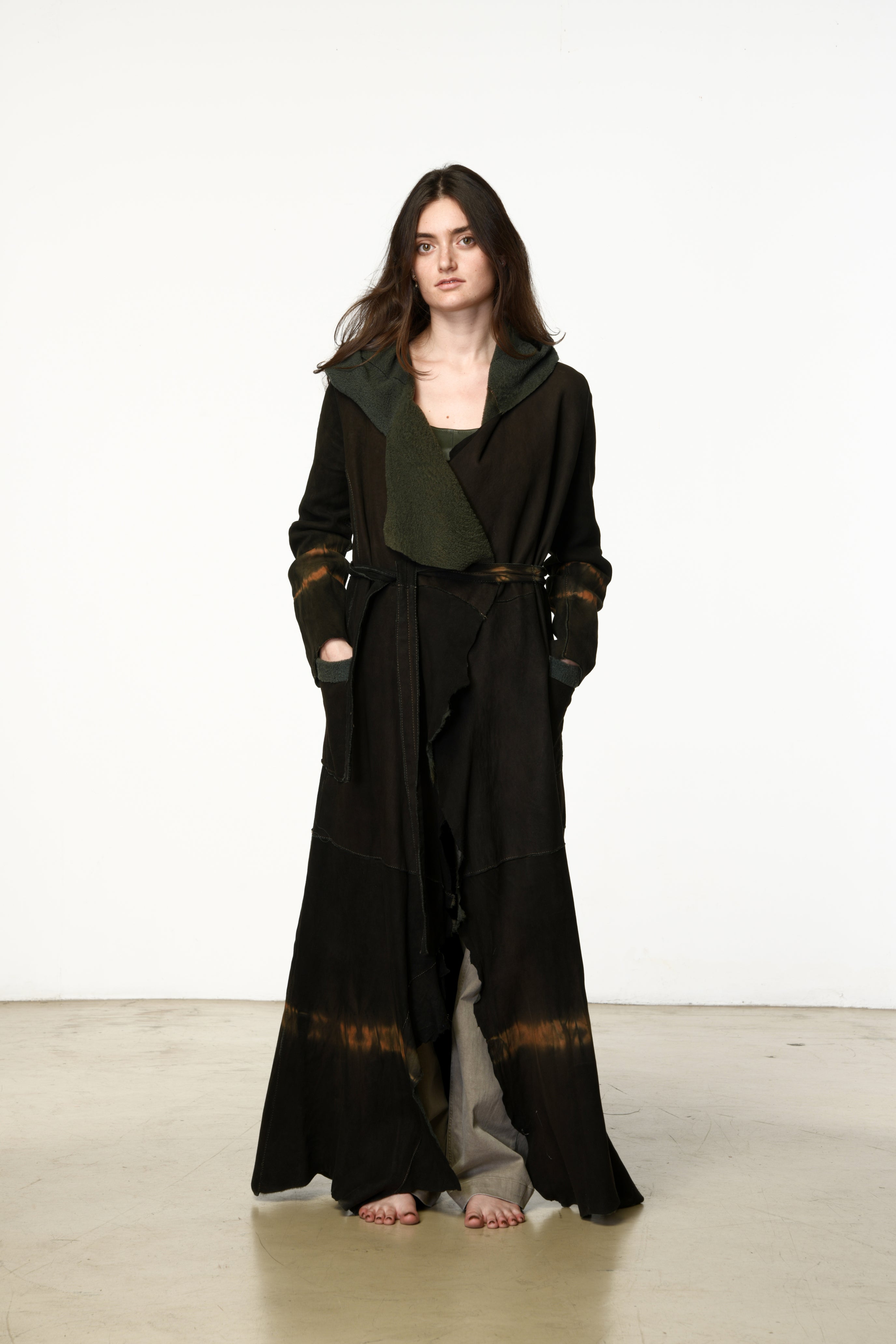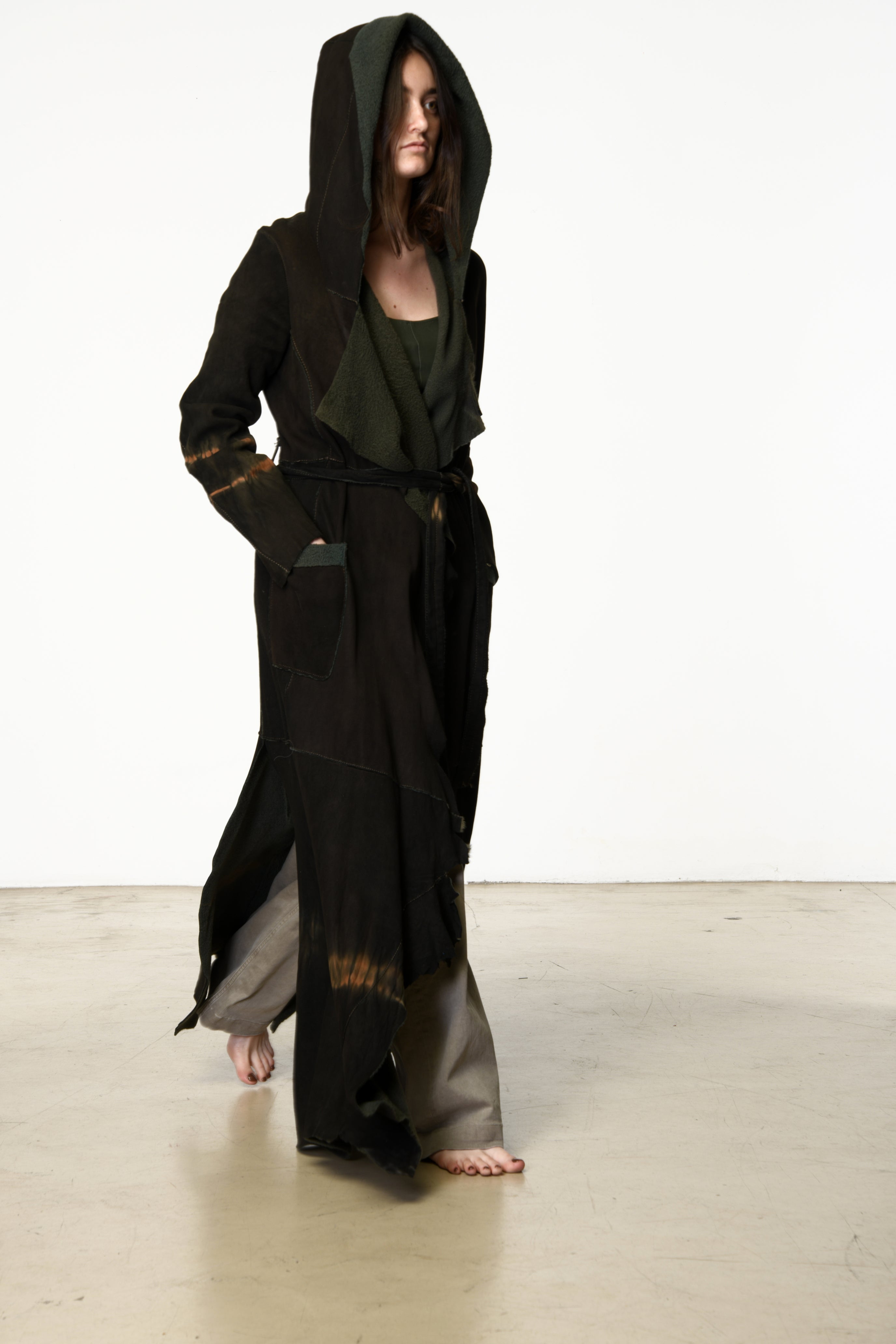 Long shearling coat with hood and robe-inspired cut. Warm and buttery soft.