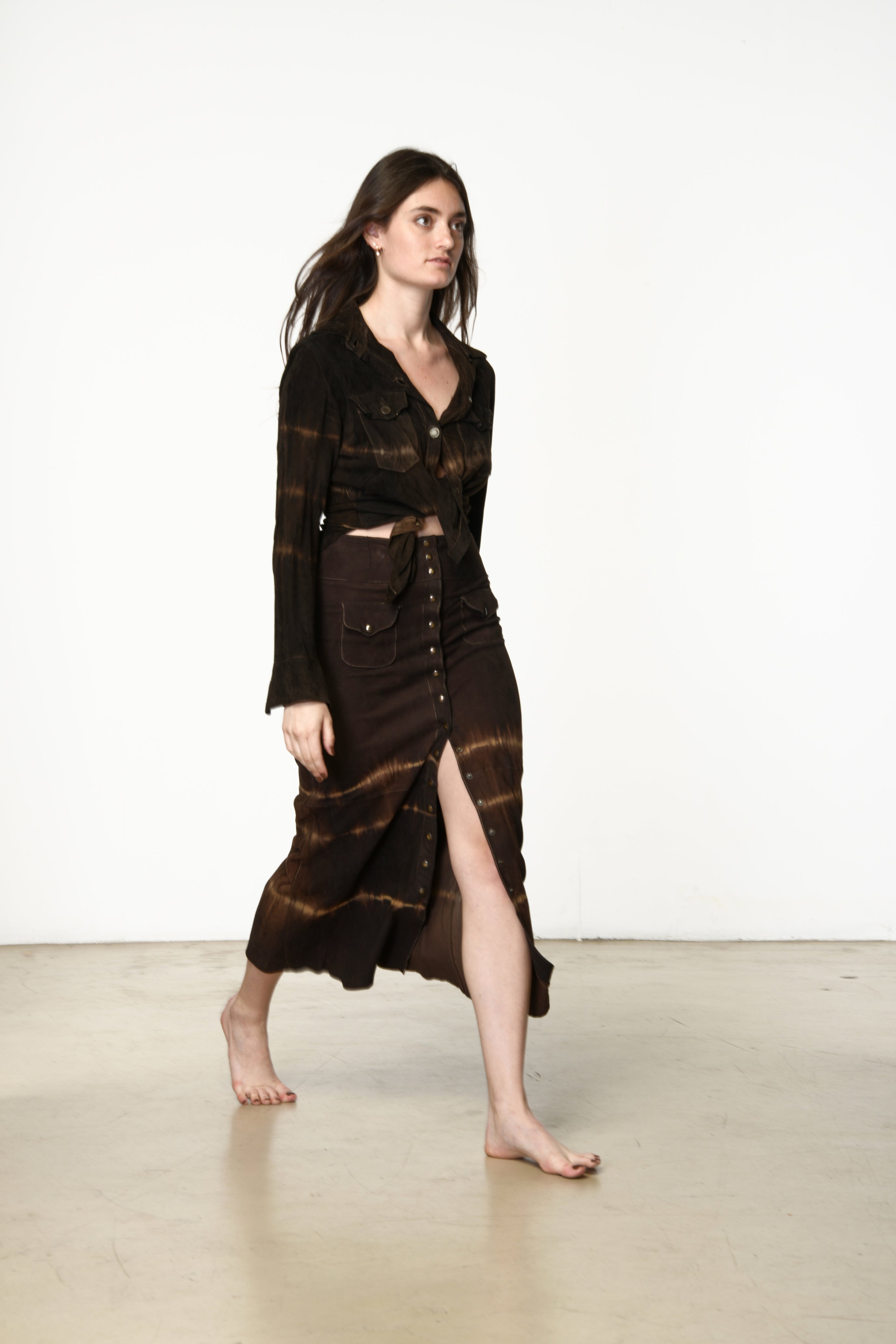 Long boho-inspired skirt with front button closure.